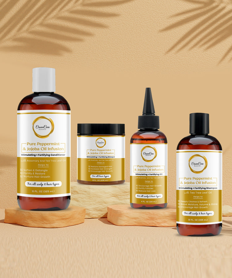 CrownCare Essence's Pure Peppermint & Jojoba Oil Infusion collection was developed with compassion for people that have continuously suffered diverse hair mishaps. The new line was formulated with blends of powerhouse essential oils, natural and organic ingredients that will revitalize your scalp and hair, to restore a healthy crown and reduce breakage.